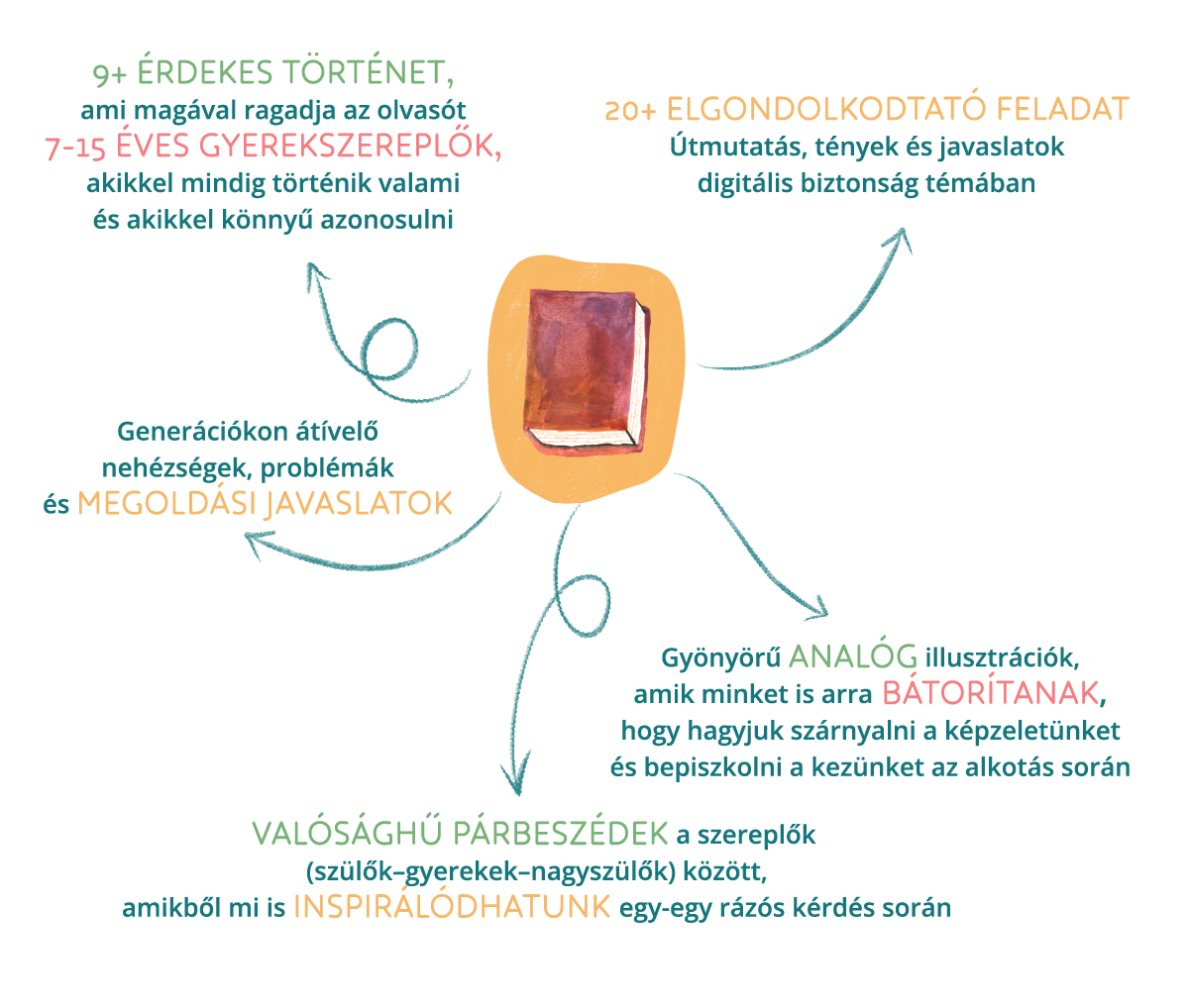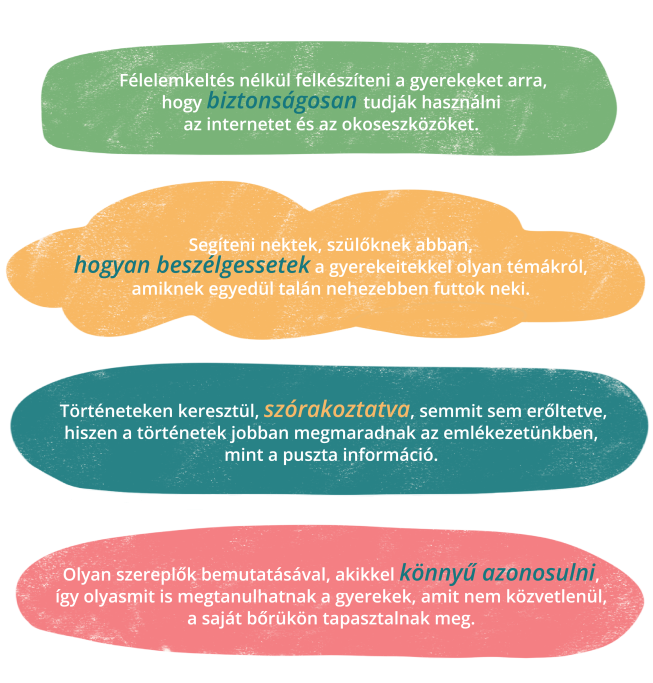 Képzeld el, hogy egy kellemes nyári délután, vagy éppen egy bekuckózós hideg estén együtt olvastok a gyerekeddel. A könyv izgalmas, leköti a gyermeked figyelmét, és téged is megszólít. Azon túl, hogy tartalmasan telik az időtök, ez a könyv – akár tudatosul az olvasóban, akár nem – olyan lényeges témákat ágyaz történetekbe, amik megalapozzák a gyerekek biztonságát offline és online egyaránt.