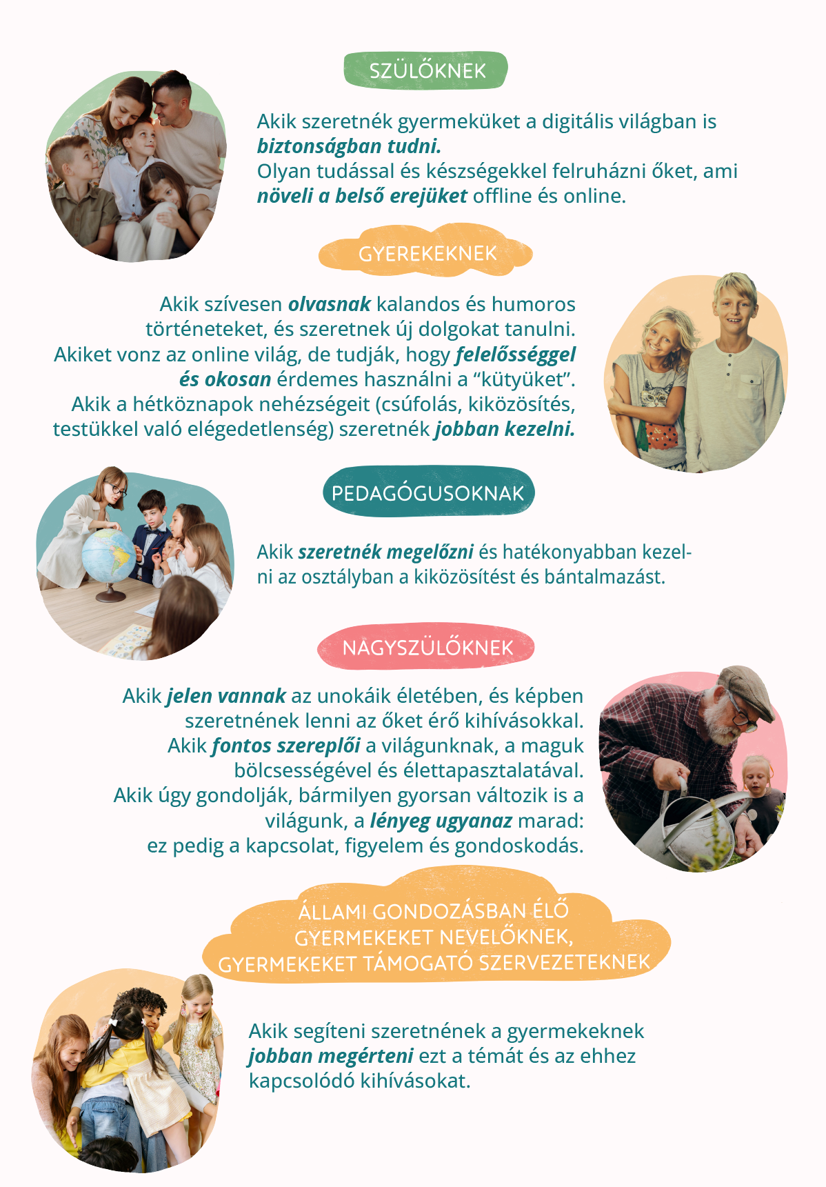Minden történetet elgondolkodtató rész követ, ahol konkrétabb, kézzel fogható segítséget kaphat mind a szülő, mind a gyerek, mi is a teendő, ha például valakiről az engedélye nélkül megosztanak egy fotót. Ezek a feladatok külön, nyomtatható formában is kaphatók!